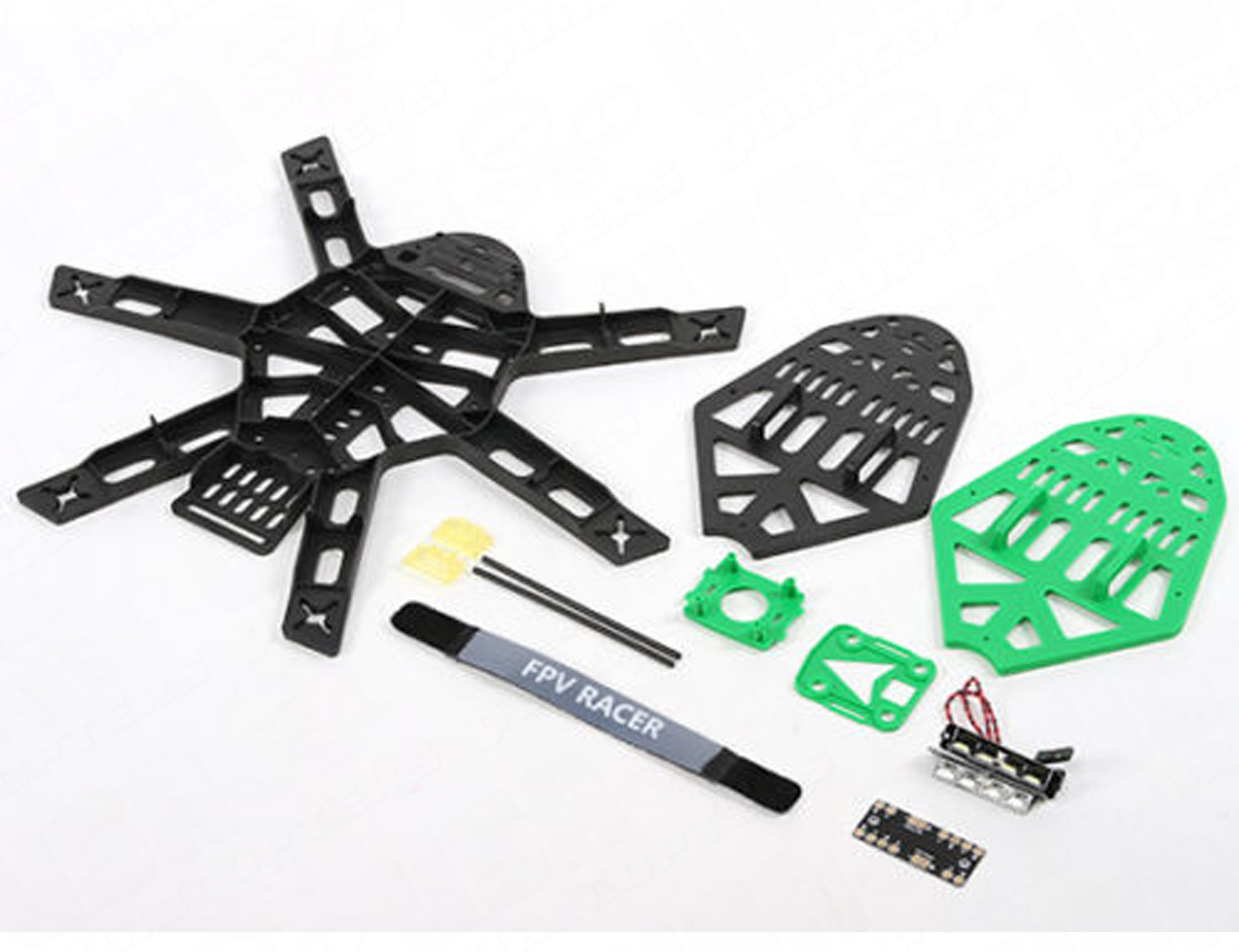 Frame Kit Details: 1 x Frame black 2 x Top plate (one black and one green) 1 x LED PCB 1 x PDB 1 x Strap 1 x Antenna mounting set